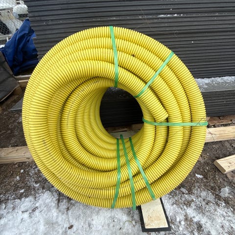 Gul fleksibel slange i plast, levert som kveil. Egnet til bruk der det trengs en bøyelig slange, for eksempel til drenering, kabelbeskyttelse eller annen teknisk installasjon. Slangen kan kappes til ønsket lengde etter behov.