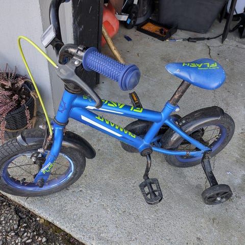 DBS barnesykkel med 12" hjul. Sykkelen har ramme i grønn farge, blå felger og sete, samt rød gaffel. Passer for mindre barn som skal lære å sykle eller bruke sykkelen til korte turer på asfalt eller faste underlag. Enkel konstruksjon med lav innstigning som gjør det lettere for barnet å komme av og på sykkelen.