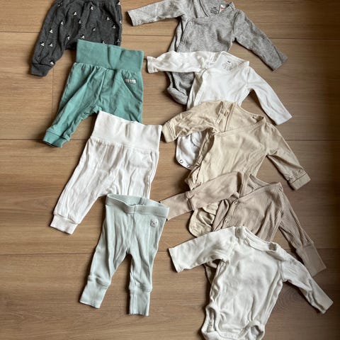 Klespakke til baby i str. 56, fra H&M og en bukse fra Cubus. Inneholder tre ulike bodyer og tre bukser, pent brukt og masse bruk igjen. Nøytrale toner som passer både til jente og gutt.