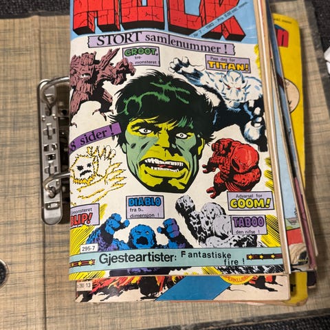 Blandet lot med tegneseriehefter fra DC Comics og Marvel. Samlingen inneholder flere norske utgaver med blant annet Superman, Superboy, Superserien, Gigant og et hefte med Hulk. Heftene er i farger og har varierende sidetall. Egner seg for samlere av superhelt-tegneserier og for lesere som ønsker klassiske historier med kjente figurer fra DC- og Marvel-universet.