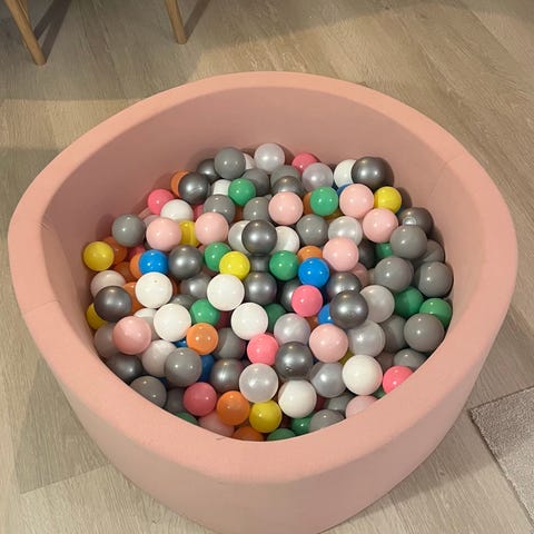 Ballbasseng formet som et rosa hjerte. Fint plass til to barn. Laget i myke materialer slik at barna trygt klatrer inn og ut. Følger med en pakke med lilla baller og en pakke med hvite baller.