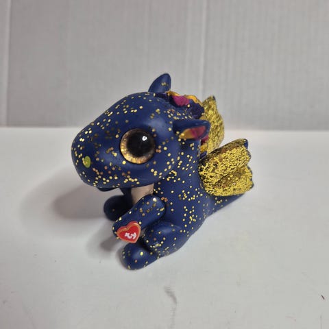 Figuren forestiller en liten drage med vinger, hale og kam i regnbuefarger. Myk plysj som passer som kosedyr eller pyntegjenstand på barnerom. Har originalt Ty-merke med navn og informasjon.