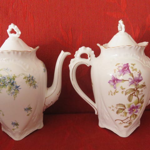 To gamle fine stolpekanner fra PP selges, dekormerket på den til venstre er 1872, den andre er merket 1752, pris pr kanne 350, frakt tilkommer, tlf 958 74 807