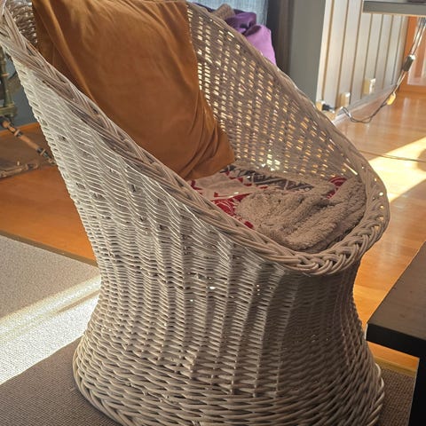 Pent brukt hvit kurvstol fra ikea. Stått på gjesterom.