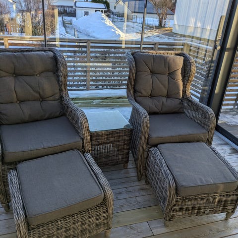 Puter har vært oppbevart i boden, sammen med den minste delen. Selve sofaen har vært oppbevart ute under presenning på vinteren. Delvis under tak. Denne vinter har alt vært oppbevart innendørs i boden.