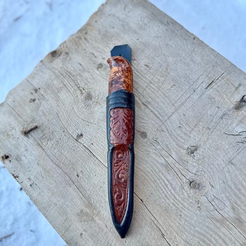 Spesiell kniv laget av flammebjørk og lær selges ! Kniv med slire 21 cm. Skaft 9 cm og blad 8,5 cm merket Søndrål. Selges kr. 1600,- eller bud .