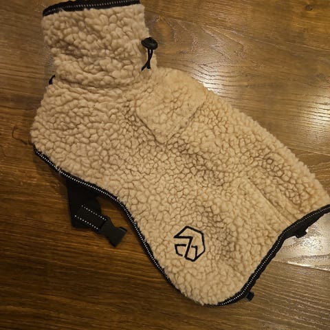 Vannavstøtende stoff utvendig med to refleksbånd. Strikk/fleksibel rundt halsen og for bakbena. Dekken også over brystet med feste rundt kroppen (innsiden) med klips, regulerbar lengde. Innsiden har bløt/fleeceaktig stoff.