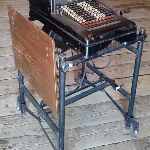Original Odhner mekanisk kalkulator i svart metall. Klassisk skrivebordskalkulator med roterende sylinder og tallruller for manuell utregning. Maskinen har hendler og knapper for blant annet addisjon og multiplikasjon, samt egen resultatteller i front. Produsert i Sverige, egnet som teknisk samleobjekt eller illustrasjon av historisk regneteknikk.