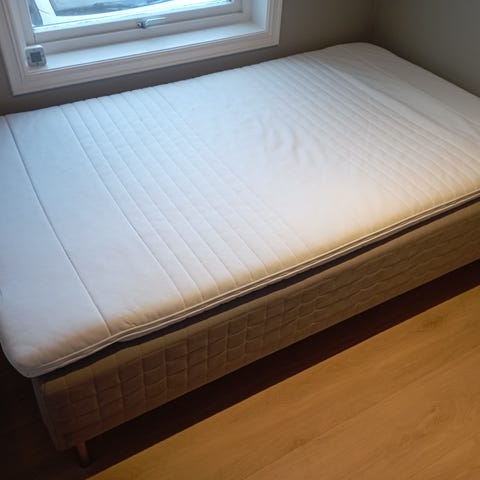 100kr Mørke grå seng (120cm) er god og ligge i, men kan finne på å knirke. Beina kan skus av for flytting