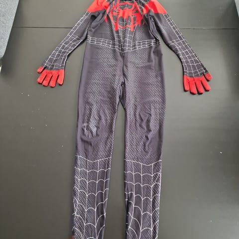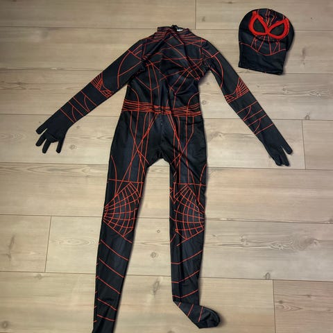 Spiderman kostyme heldrakt for unisex i størrelse 130. Drakten er rød og svart med trykk som etterligner Spiderman-drakt, og leveres med matchende hette/maske. Heldrakten har glidelås bak for enkel av- og påkledning, samt integrerte fot- og håndpartier. Egnet som utkledning til karneval, temafester eller lek hjemme.