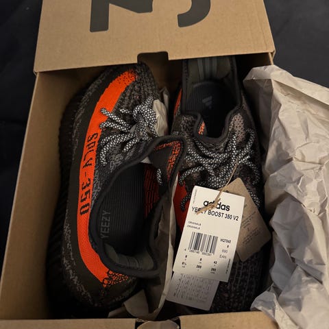 Adidas Yeezy Boost 350 V2 sneakers i størrelse 42. Modellen har karakteristisk yttersåle med mønster og synlig demping i sålen. Overdelen er konstruert for komfort og støtte ved daglig bruk. Passer som joggesko eller fritidssko.