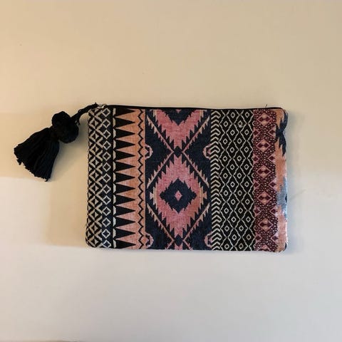 Pouchen har et fargerikt og detaljert mønster i blå, rosa, lilla og gule toner, inspirert av tradisjonelle norske strikkemotiver. Innsiden er foret og har glidelås, perfekt for nøkler, mobil, sminke eller småting du vil holde samlet. Den kommer med original tag (Pouch bag Ingrid – 1013‑X08‑01, One Size) og merkeetikett, og er helt ny og ubrukt.