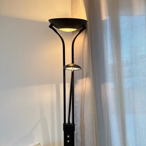 gulvlampe designet. Lampen har en rund metallfot, slank stang og ovalt hvitt glasskjerm som gir et jevnt og diffust lys. Egner seg som belysning i stue, kontor eller andre oppholdsrom. Lampen betjenes med fotbryter på ledningen.
