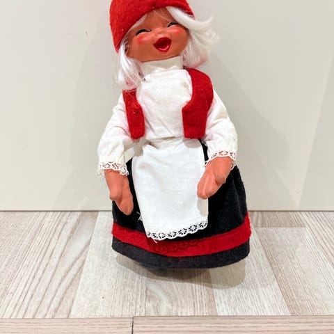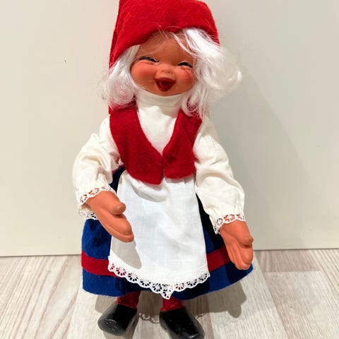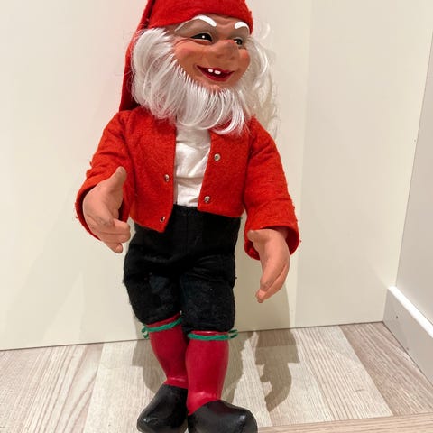 Nissefar. Ingenskader eller hull, men litt bruksmerker og klærne har litt nupper. Kanten på lua har også mistet formen litt - virker litt stor, men kan brettes inn og stiftes igjen. ;-)