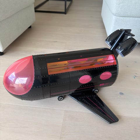 L.O.L. Surprise lekesett fly for dukker. Lekesettet er utformet som et fly med flere rom og fargerike detaljer innvendig. Kabinen kan åpnes for lek, og det er sitteplasser og interiør tilpasset små dukker fra L.O.L. Surprise-serien. Yttersiden er hovedsakelig svart med rosa og flerfargede detaljer. Egnet som tilbehør til L.O.L. Surprise-dukker for rollelek og fantasifulle lekeoppsett.
