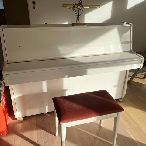 Oppreist piano i svart utførelse. Instrumentet har klassisk rett design med rektangulær form og avrundede kanter, samt et ovalt dekorfelt på fronten over tangentene. Standard klaviatur med hvite og sorte tangenter. Passer til øvingsrom, stue eller andre innendørs rom der det er behov for et akustisk piano. Det anbefales stemming og eventuell teknisk gjennomgang etter transport og før regelmessig bruk.