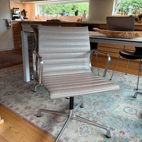 Selger en elegant og tidløs designstol i hvitt skinn, inspirert av den ikoniske Vitra Eames stol. Perfekt kombinasjon av stil og komfort – passer både i stue, kontor eller som et flott statement-møbel.