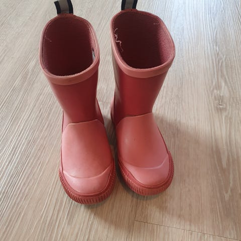 Kavat gummistøvler i størrelse 27. Støvlene er i en rødfarge med grov såle for godt grep. De har middels høyt skaft og hempe bak for enklere av- og påkledning.