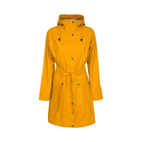 Modellen kombinerer regnfrakk og trenchcoat i ett. Lett materiale med vannavstøtende belegg og teipede sømmer som hindrer lekkasje. Fôret med myk polyesterjersey på innsiden for komfort. Toveis glidelås under knappelukking gjør den praktisk, blant annet ved sykling. Har hette og belte i livet som gir en feminin silhuett. Fargen Golden Yellow er en klar og frisk gulfarge.