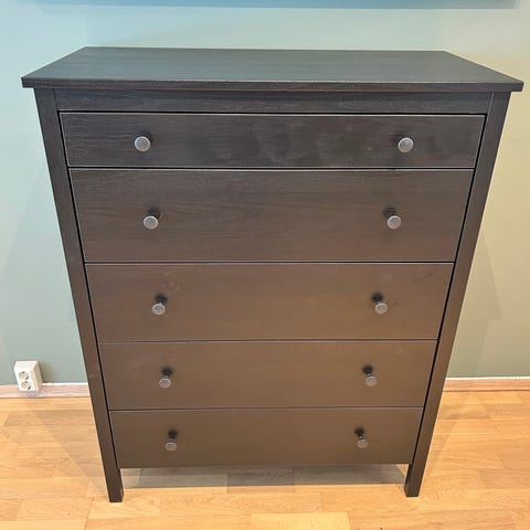 Sort hemnes kommode fra IKEA. Et par småting på topplaten, men har ikke vært noe jeg har tenkt på ved bruk. Siden det er heltre kan denne alltids pusses og males om man ønsker det.