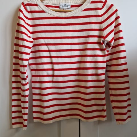 Ganni genser med striper i størrelse XS. Genseren er i 100% økologisk bomull med kule detaljer som synlige sømmer og Ganni-tag på baksiden.