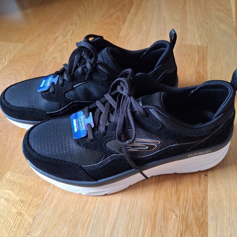 Skoene er brukt noen få ganger og fremstår uten synlige merker i overskinn. Under viser fargen på sålen at de er noe brukt.