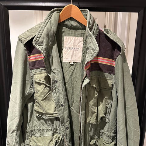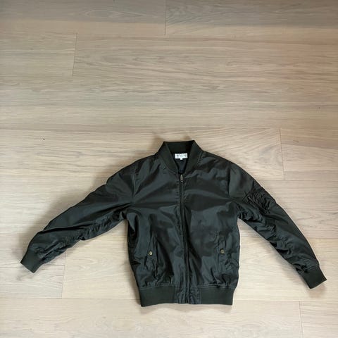 Kul halvlang grønn Valient ytterjakke med grove glidelåser og oransje detaljer. Vår/høst. Mange lommer, hette og snøring nederst.