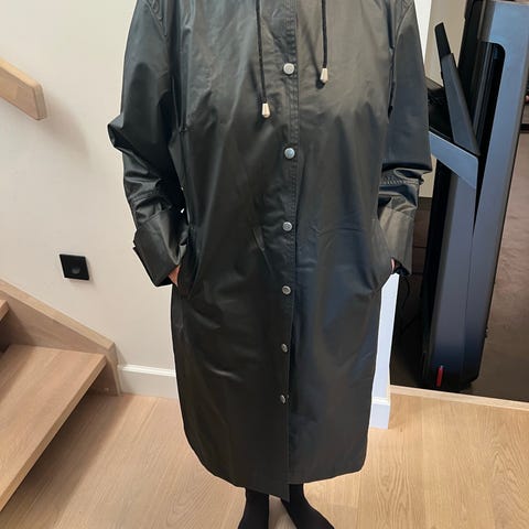 Zizzi regnjakke for dame i størrelse XXL/54/56. Jakken er svart og laget i polyester. Den har hette, knappelukking foran og lommer med klaff og knapp. Lengden går ned mot knærne, og ermene har strikk nederst for bedre beskyttelse mot regn. Passer som yttertøy på regnværsdager.