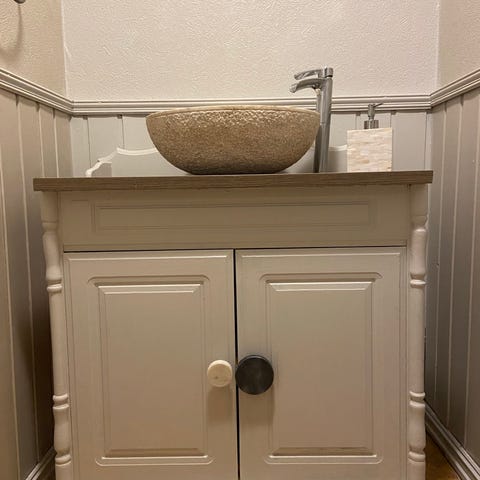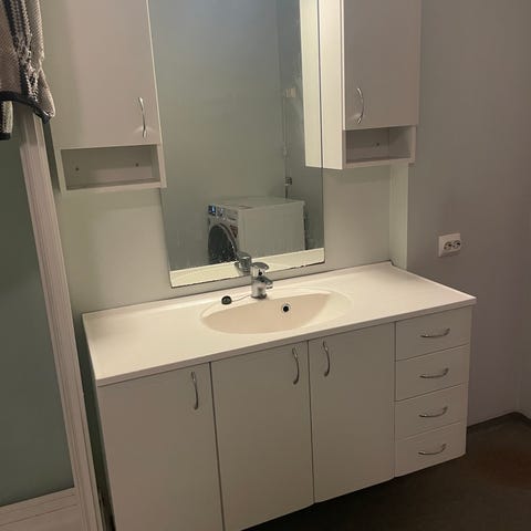 Servantskap med integrert servant og batteri, speil og overskap. Kan hentes sammen eller enkeltvis.