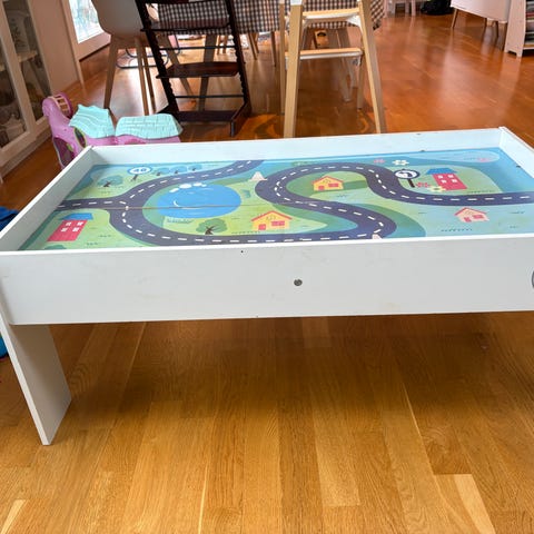 IKEA barnbord med aktivitetsinnlegg. Bordet er i tre med utsparinger til plastkasser, egnet for lek med sand, vann eller andre sanseaktiviteter. Det følger med plastkasser i grønn og blå samt hvite lokk/plate som kan legges over for å få en jevn bordflate. Passer som aktivitetsbord eller tegne- og lekeplass for barn.