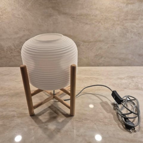 Jysk bordlampe med skjerm i rotting. Lampen har sylinderformet skjerm og stativ med ledning og bryter. Passer som bordlampe i stue, soverom eller andre rom der det er behov for punktbelysning. Bruker standard lyspære.