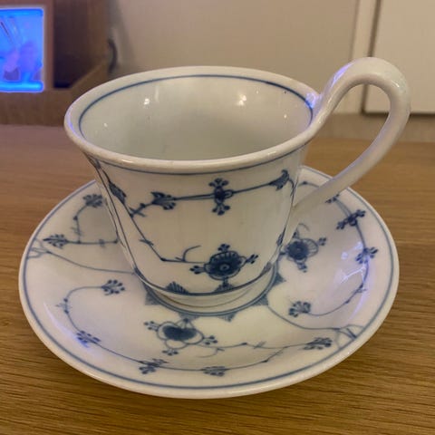 Blått og hvitt porselen kaffekopper med skål og asjett. Sett med fire kopper, fire skåler og fire asjetter. Dekor i klassisk blå-hvitt mønster med landskapsmotiv. Egnet til servering av kaffe eller te. Porselenet har rund form på koppene og matchende mønster på skåler og asjetter.