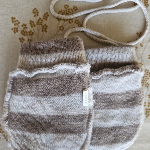 Joha ulltøfler for barn i størrelse 68, unisex. Vottene er laget i ull og har beige farge. Egner seg til bruk på kjølige dager for å holde små føtter varme.