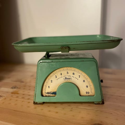 Selger denne retro vekta som er i fin stand og gir en helt egen vibe! Skåla som ligger oppå er det noen bulker i (som vist på ene bilde), men dette har ingenting å si for bruken! Ellers i fin stand!🫶🏼Den er ca 23 cm høy!