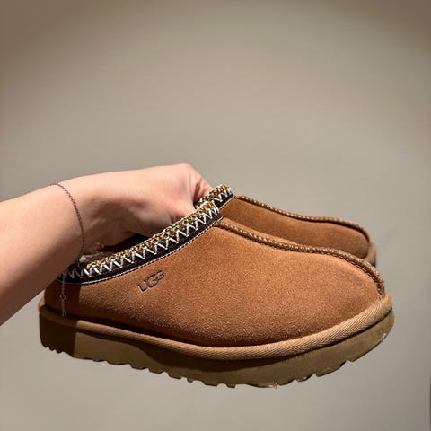 Ubrukte og nye UGG Tasman II tøfler i størrelse 37. Farge Chestnut. Modellen er laget i brun semsket skinn med dekorativ kant rundt åpningen. Innvendig har tøflene mykt, fôret materiale for komfort. Yttersålen er kraftig og mønstret for godt grep. Dette er en damevariant som egner seg som innetøfler eller til lett bruk utendørs på tørt underlag. Selges grunnet feil størrelse.