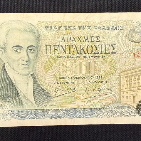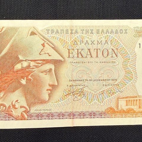 Bank of Greece 50 drachmai seddel. Gresk papirpengeseddel med pålydende verdi 50 drachmai. Forsiden viser portrett og dekorative mønstre med gresk tekst og tallverdi 50. Baksiden viser motiv med seilskip, fjellandskap og personer, sammen med pålydende verdi og gresk tekst.