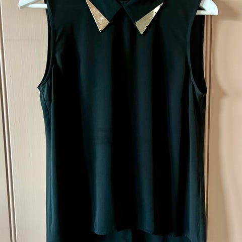 Vero Moda ermeløs topp i størrelse L. Den har krage med svarte og gullfargede paljettdetaljer og skjult knappestolpe foran.