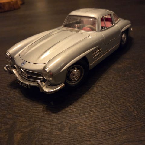 Mercedes-Benz 300SL lekebil i brun metallfinish med lyse interiørdetaljer. Modellen har åpnbare dører og detaljerte felger og støtfangere. Egnet som samlerobjekt eller som lekebil for barn som liker klassiske biler. Størrelse og skala 1:18