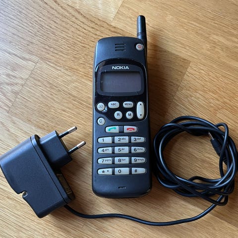 Klassisk mobil med fysisk tastatur, liten skjerm og uttrekkbar antenne. Original bruksanvisning og ladekabel følger med.