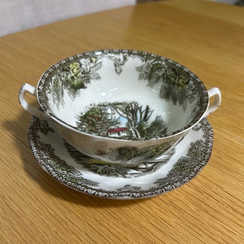 Johnson Bros The Friendly Village fløtemugge og liten skål i porselen. Serviset er dekorert med landsbymotiv i flere farger med natur- og husmotiv rundt hele delene. Fløtemuggen har markert helletut og hank, og skålen har samme motivserie. Begge deler er merket «The Friendly Village – Made in England by Johnson Bros» under. Egner seg som del av servise til borddekking eller som dekorative samleobjekter.