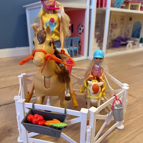 Barbie hestelekesett med flere plastikkhester, stall og gjerde. Settet inkluderer Barbie-dukke med rideklær, flere ridehester i ulike farger. Den hvite hesten går på batterier og kan bevege seg, hinder til sprangridning, saler, hodelag og annet ridetilbehør som kost og bøtte.