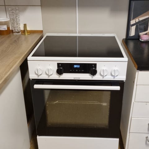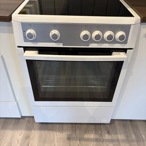 keramisk komfyr med platetopp og stekeovn. Komfyren har keramisk koketopp med flere kokesoner og frontplasserte brytere for regulering av varme. Stekeovnen har rist og stekebrett, samt glassdør som kan åpnes nedover. Passer til frittstående plassering på kjøkken. Hvit utførelse med sort topp og ovnsdør.