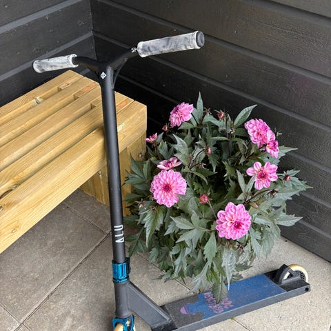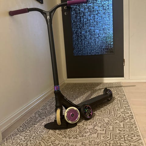 Custom bygget triksesparkesykkel. Oppsette: har scooter hut titanium T-bar med odi grips, etich aliminuim deck og helt nye honeycore hjul, veier cirka 3,4kg. For mer spesifikke detaljer ta kontakt!, brukt rundt 7000kr på den. Selges da som jeg ikke har interesse for dette mer. Sparkesykkel i Elite/Verdenklasse. Får ikke bedre deler. Har også en helt ny street clamp som matcher med forken!