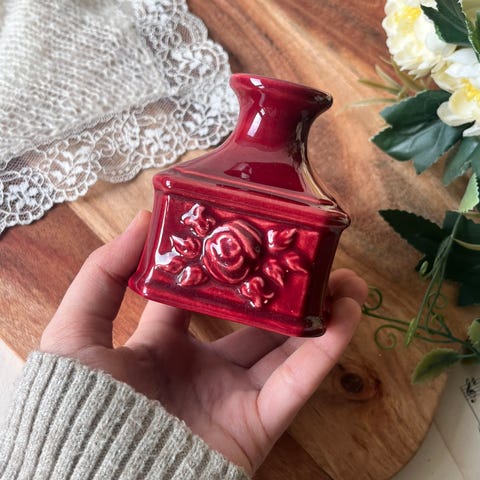 Nydelig grønn keramikkvase i pen form med relieff av roser og blader. Har små håndtak på sidene og dekorativ fot. Glasert i dyp grønn farge. Perfekt som pyntegjenstand eller til små blomster. 🌿 Se bilder for mål.