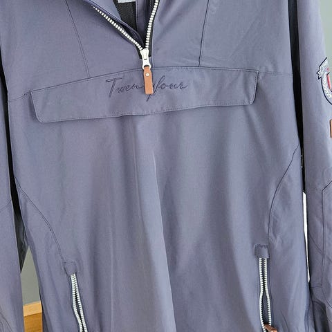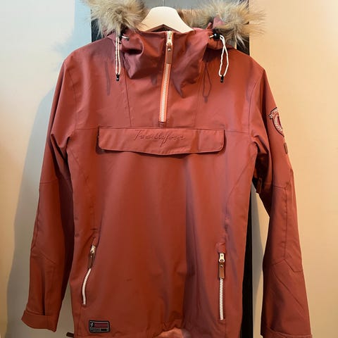 Twentyfour anorakk jakke i damemodell størrelse M. Jakken er i en mintgrønn farge med hette og avtagbar eller fast fuskepelskant (basert på bildene). Den har halv glidelås i front, stor brystlomme med klaff og sidelommer med glidelås. Justering nederst på jakken for bedre passform. Ytterstoff i teknisk materiale egnet til bruk ute, for eksempel til tur og hverdagsbruk.