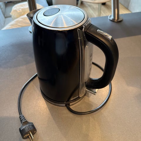 Coline vannkoker i rustfritt stål med svart håndtak og lokk. Elektrisk modell med ledning og separat sokkel. Passer til koking av vann til te, kaffe og annen matlaging der varmt vann er nødvendig.