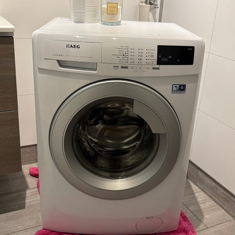 AEG frontmatet vaskemaskin i hvit utførelse. Maskinen har frontinnlasting med rund luke i glass og oversiktlig betjeningspanel øverst med programvelger og display. Egnet for plassering i vaskerom eller bad der det er behov for en frittstående frontmatet vaskemaskin.