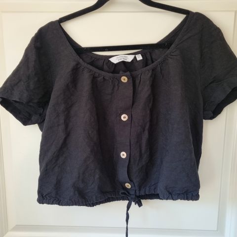 KappAhl topp for dame i størrelse M. Toppen er svart og laget i lin. Den har brede stropper og rett fasong. Passer til hverdagsbruk eller enklere anledninger, og kan kombineres med både bukser og skjørt.