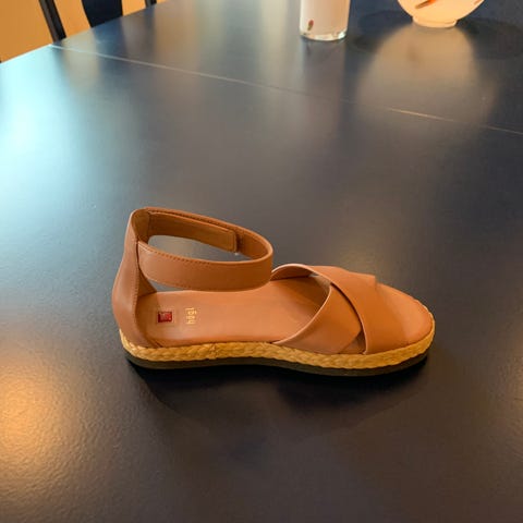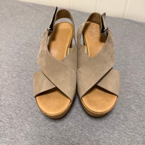 Högl sandaler med kilehæl i størrelse 38. Modellen har åpen tå, bred rem over foten og justerbar ankelrem med spenne.
