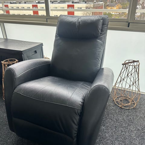 God og romslig recliner i sort skinn selges. Stolen har manuell reclinerfunksjon og gir svært god sittekomfort – perfekt til TV-kvelder eller lesing.
